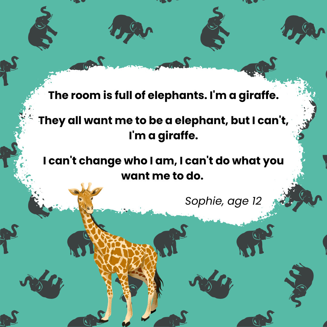 Now everyone wants me to be an elephant and do everything they all do but I can't because I'm a giraffe. I can't change myself because I'm a giraffe not an elephant."