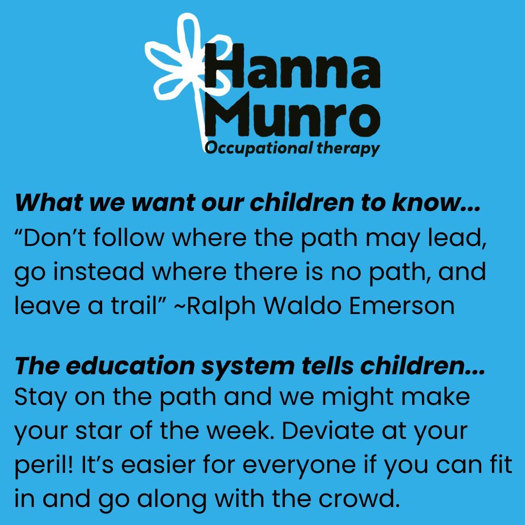 I was thinking this week about some inspiring quotes I've heard. Things like, "don’t follow where the path may lead, go instead where there is no path, and leave a trail”. This is the kind of message I live by and I'd like my children to follow. However, I feel that the current education system contradicts these inspiring messages and tells children a different story. At the end of this email you can see some visuals I've put together comparing inspiring quotes with the messages the education system tends to send (you might have to click somewhere to allow images to be shown in this email).