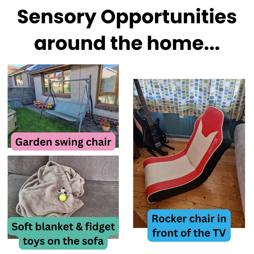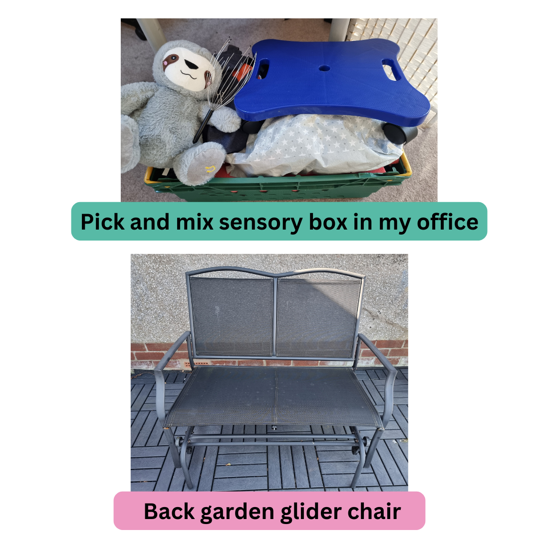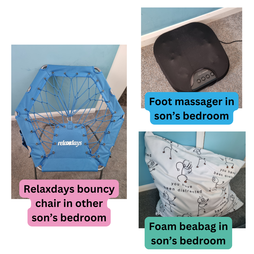 Below you can see photos of the rooms in my house, focusing on the sensory equipment we have for our boys aged 10 and 12. As you can see, we have equipment outside, in the living room, the hallway, my bedroom, my office and both boys' rooms. I believe that having this key equipment out and available at all times makes such a difference in helping my children regulate before and after school. We never suggest they use a piece of equipment (otherwise they wouldn't use it!) but having equipment in most rooms means they interact with it when they want and need to.